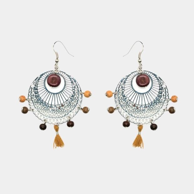 - Composée d’un pompon, de petites perles rondes breloques de bois précieux multicolore, ce modèle se distingue d’une forme créole très orientale avec une perle en essence d’amarante centrale.