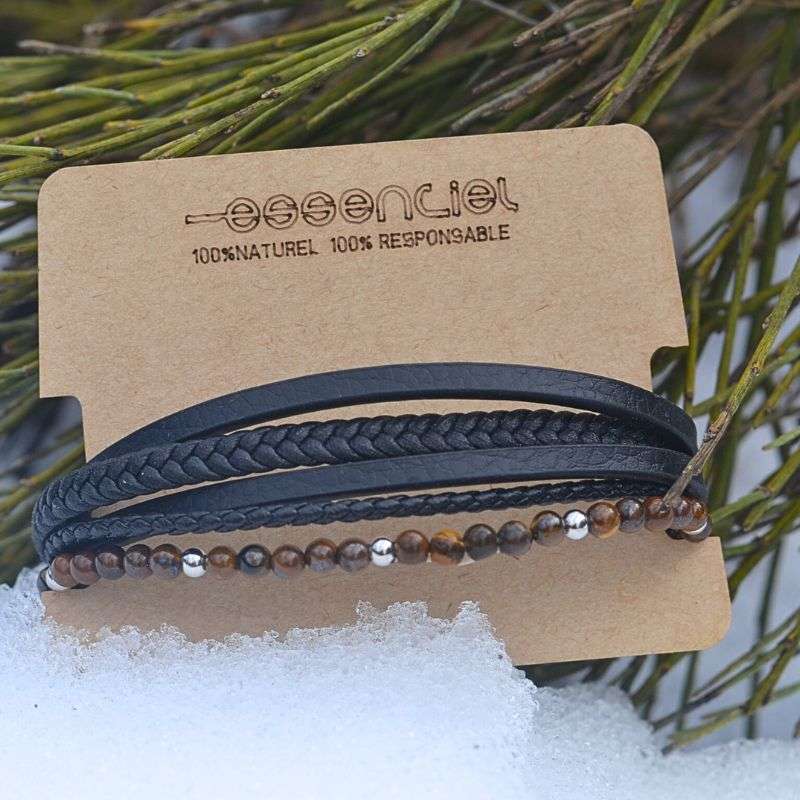 Apportez une touche de caractère et d’élégance à votre style avec ce bracelet homme pierres Santiago, un modèle pour homme audacieux qui allie cuir noir intemporel et pierres naturelles en œil de tigre.