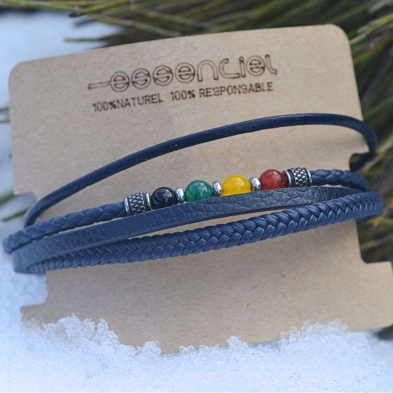 Apportez une touche d’élégance à vos tenues grâce à Harry, un bracelet homme unique qui allie cuir noir intemporel et pierres naturelles multicolores.