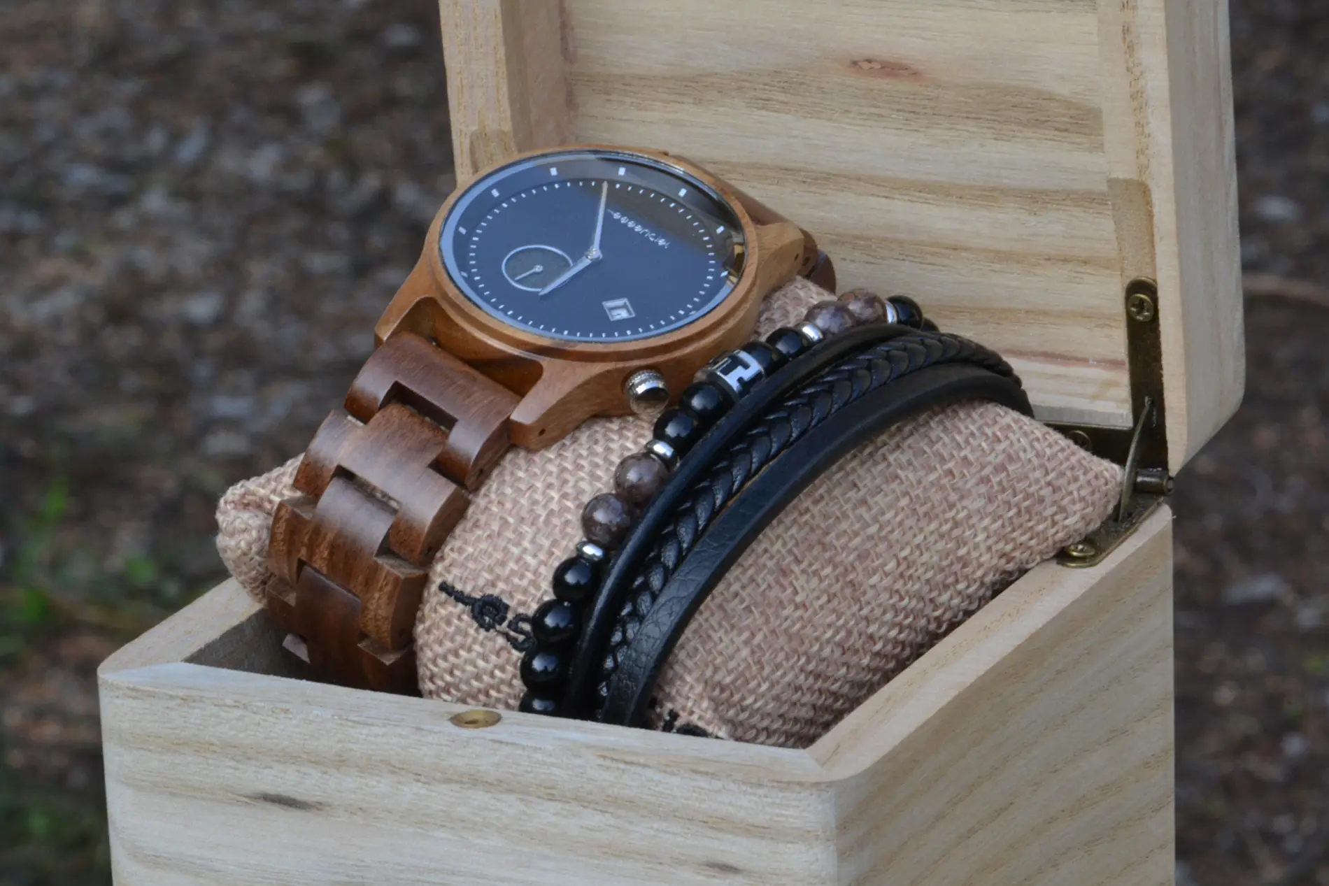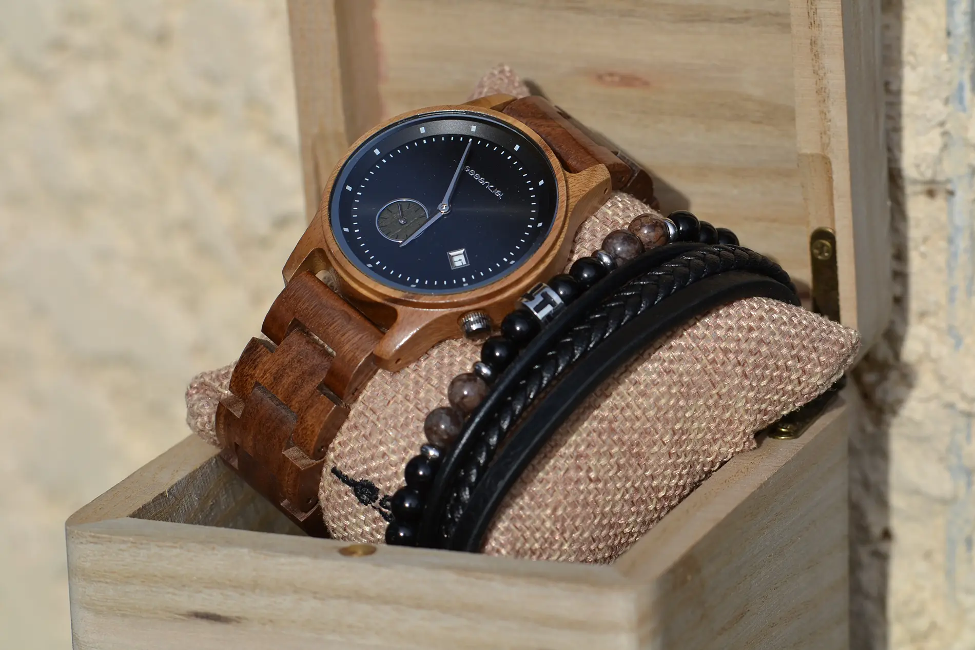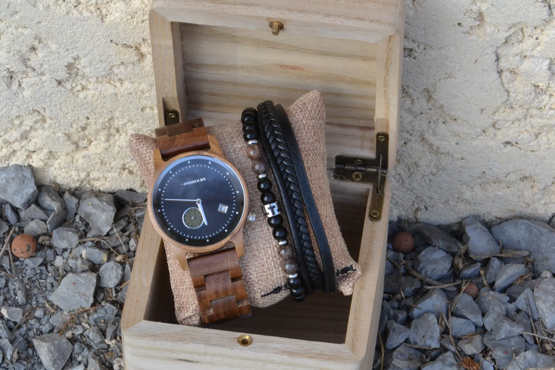 Le coffret cadeau homme Mariner incarne l’alliance parfaite entre design intemporel, matériaux naturels et charisme masculin. Il regroupe une montre en bois de noyer au style nautique affirmé, et un bracelet homme cuir & pierres naturelles. Présenté dans une boîte en bambou gravée, ce coffret est prêt à offrir pour toute occasion.