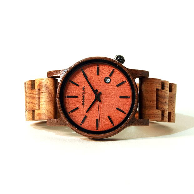 Le cadran de la montre bois homme écologiqueExplorer est un chef-d’œuvre de simplicité et d’élégance. Avec son diamètre de 38 mm, il est assez grand pour être lisible sans être imposant. Le rouge orangé du cadran contraste magnifiquement avec le bois de noyer, attirant immédiatement l’œil. Les détails en or rosé ajoutent une touche de luxe, rendant cette montre parfaite pour toutes les occasions, qu’elles soient formelles ou décontractées.