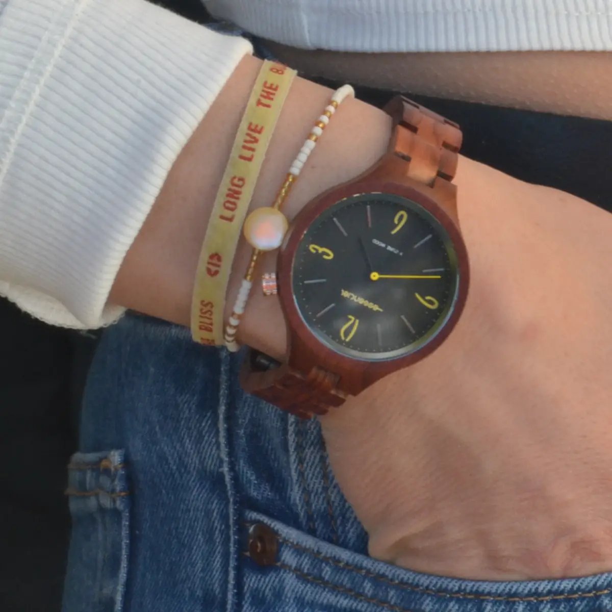 Le cadran de la montre femme bois foncé Aretha attire le regard par ses touches de jaune subtils sur les chiffres 3, 6, 9 et 12, contrastant magnifiquement avec le fond noir. Cette montre n’est pas seulement un outil de mesure du temps, mais une œuvre d’art à porter au poignet.