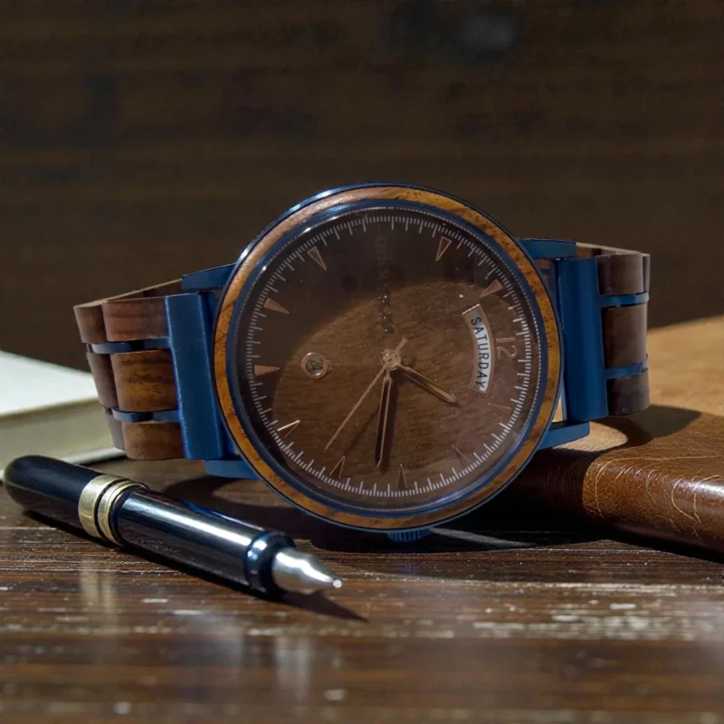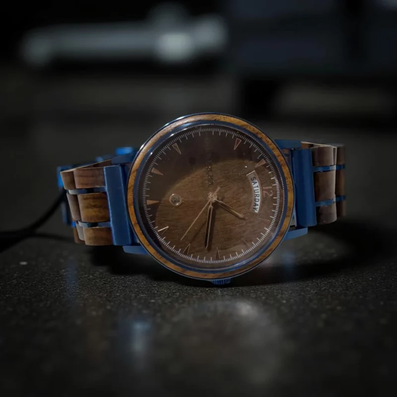Inspiré par la nature, l’artisan choisit de travailler avec le bois de noyer, symbole de sagesse et de longévité. Il croyait que chaque arbre, chaque morceau de bois, portait en lui l’histoire du monde. En associant ce bois noble à un mouvement Seiko VJ45 d’une précision inégalée, il créa des montres capables de capturer le passage du temps avec toute sa beauté et sa majesté.