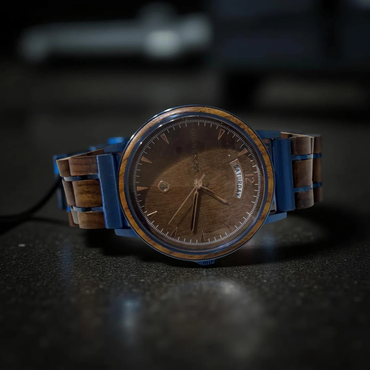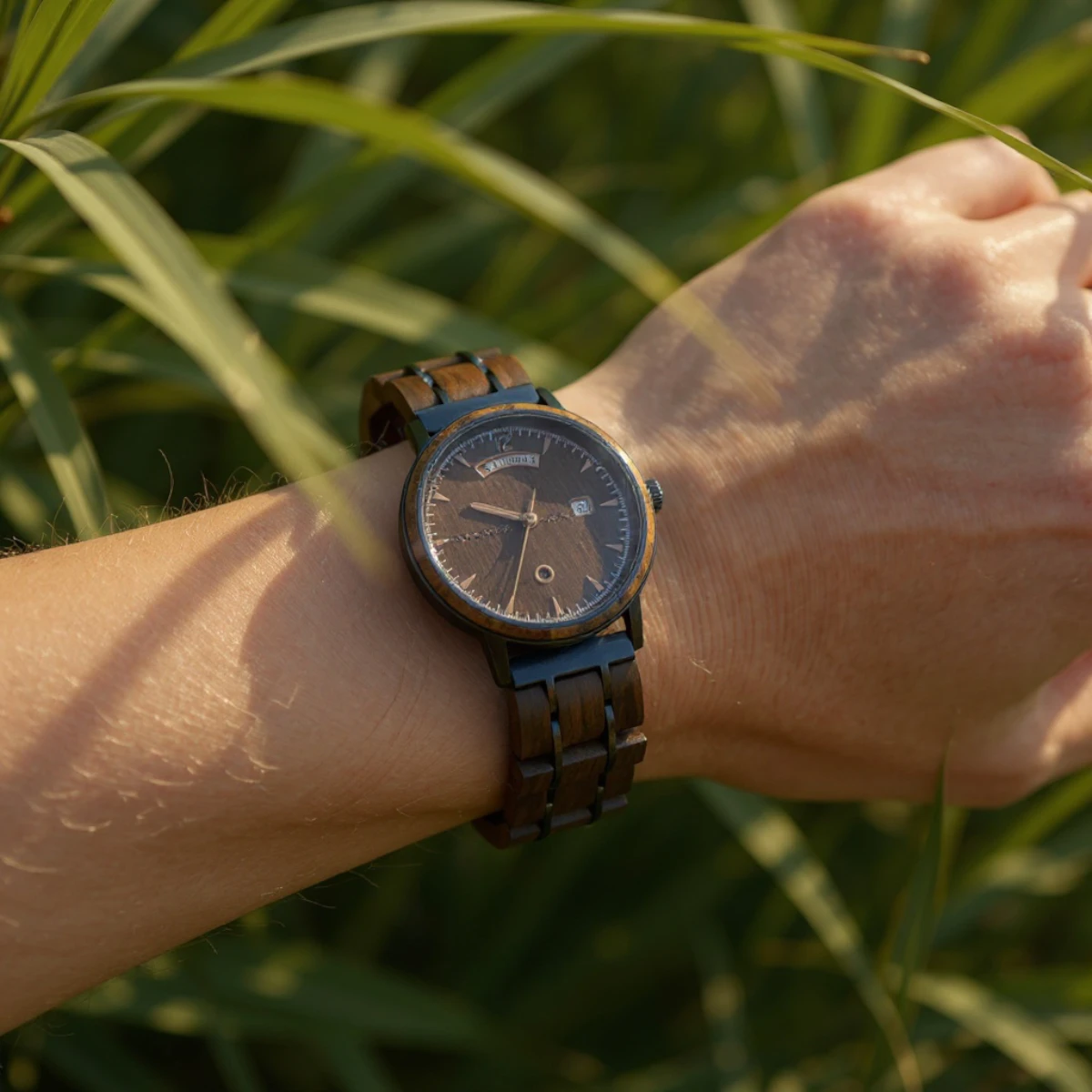 Le bracelet réglable en bois de noyer, associé à une boucle déployante en acier inoxydable, complète à la perfection le design de la montre. Il est à la fois confortable et pratique, offrant une tenue sécurisée tout au long de la journée. Le bois de noyer, avec ses nuances profondes et chaleureuses, crée une connexion émotionnelle et une esthétique naturelle qui rend chaque porté unique.